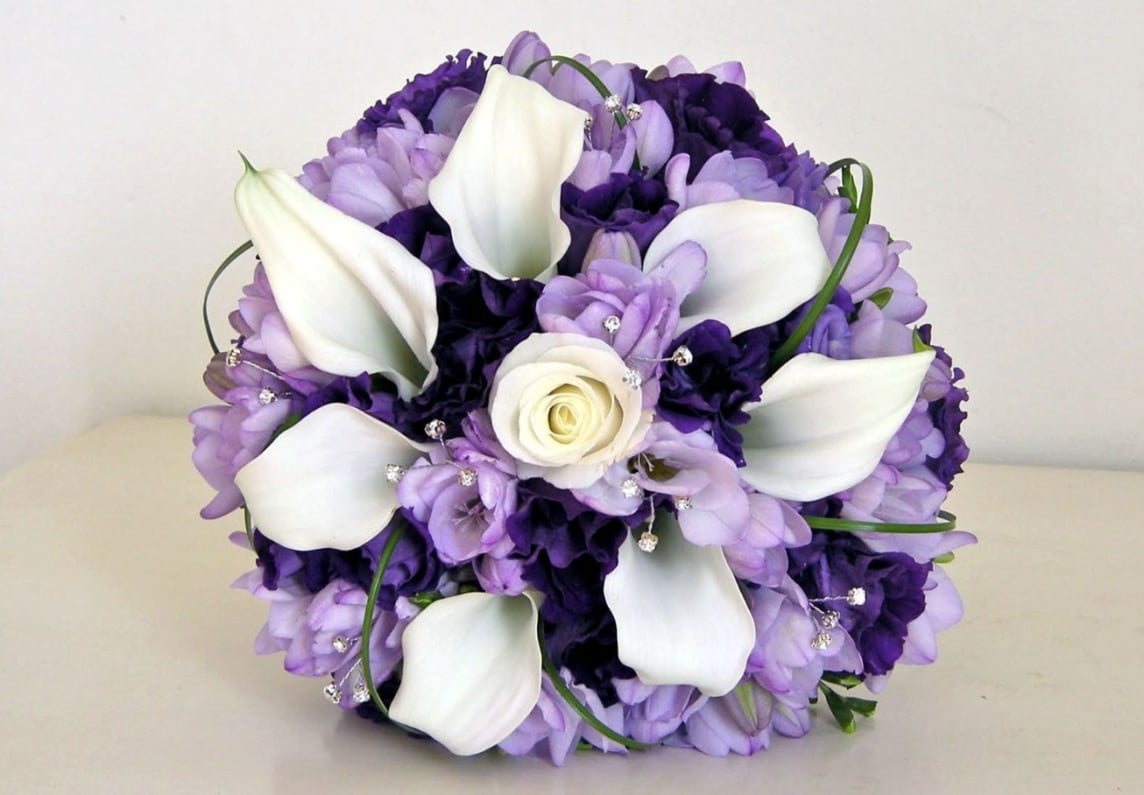 Sophistication redefined. This modern and architectural arrangement is designed to make a powerful statement. It showcases pristine white calla lilies, known for their sleek, sculptural form, alongside deep purple lisianthus and a carefully selected orchid variety. Artfully arranged with structural greenery like monstera leaves and ruscus, this piece is ideal for corporate gifting, as a striking centrepiece for a formal event, or for those with a discerning taste for contemporary design.