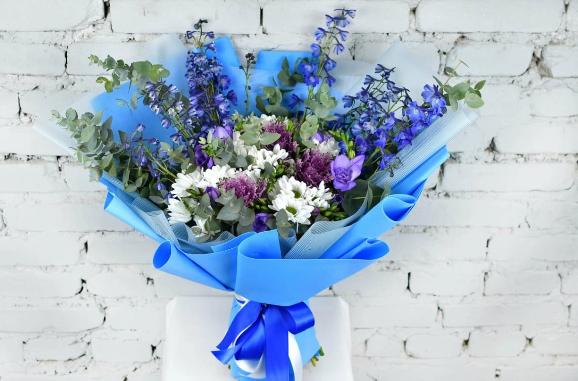 A dignified and serene arrangement designed to offer comfort and express heartfelt condolences with grace and beauty. Composed to inspire peace and reflection, it features serene white lilies, calming blue delphiniums, and soft, fragrant freesias. The gentle colour palette and elegant design provide a tranquil and respectful tribute, offering a gesture of support and remembrance during a time of loss.